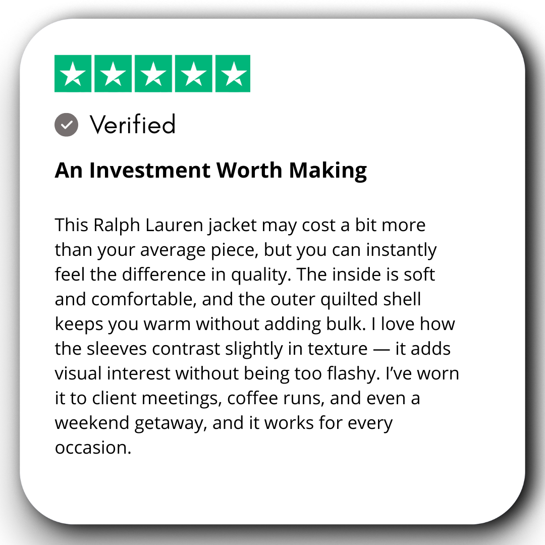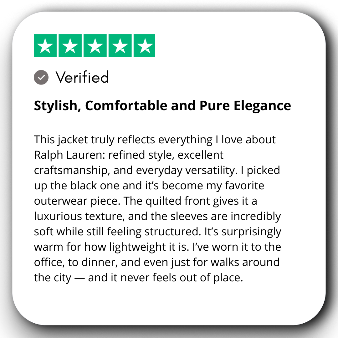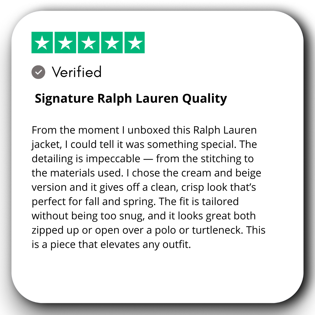 This Polo Ralph Lauren bomber jacket reimagines timeless elegance with a quilted design that adds texture, character, and a refined contemporary edge. Thoughtfully crafted details—like the soft fleece sleeves, ribbed collar, and the iconic polo player logo—make it a versatile piece that transitions seamlessly from laid-back days to more elevated outings. It’s the perfect blend of comfort, sophistication, and iconic style.
